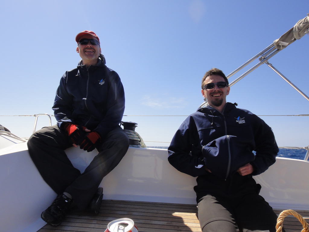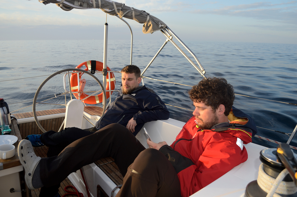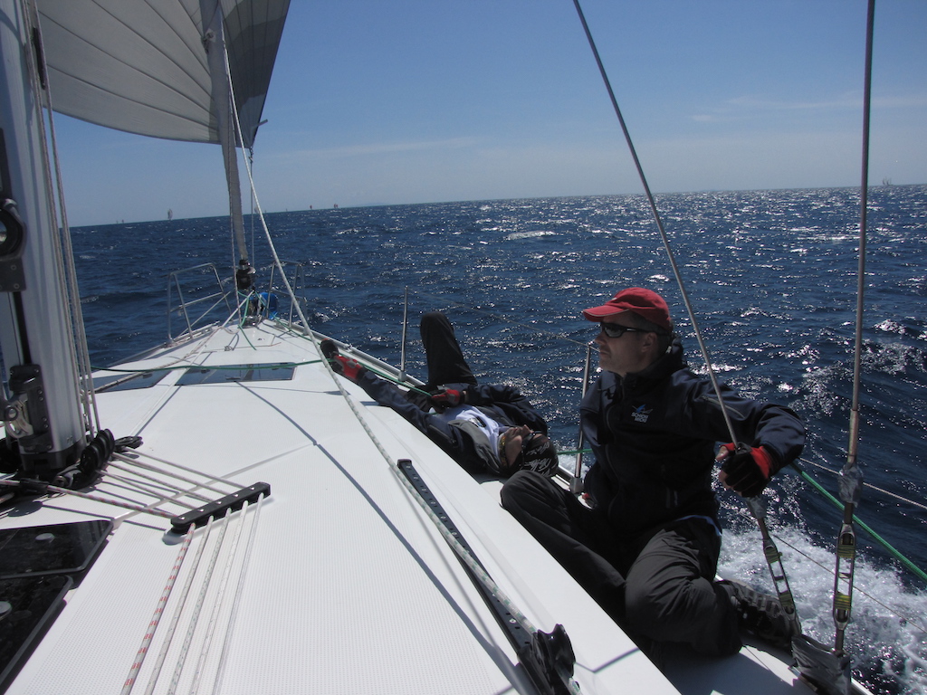 Ráno jsme prošli varianty, které máme a jako nejlepší vyhodnotili možnost protáhnout nový výtah genakru. Lano jsme měli, ale protáhnout ho skrz stěžeň v celé jeho délce se po zhruba půlhodinovém zápolení ukázalo jako nereálné. Vše ještě završil Lukáš, který se obětoval a na stěžeň vylezl, nicméně po půlhodině práce a houpání ze strany na stranu to odnesl dorobnou žaludeční nevolností a na nějakou dobu byl nepoužitelný. Znovu jsme přehodnotili situaci a vzhlem k faktu, že bez genakru v tu chvíli byla téměř polovina startovního pole, rozhodli jsme pokračovat pouze s genou. Zpětně jsme toho trochu litovali, protože nikoho z nás nenapadlo sundat genu a její výtah použít na genakr. Tento nápad by nám mohl vynést o pár pozic lepší umístění, ale to jsou jen kdyby.