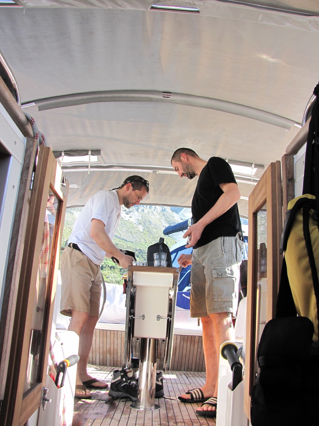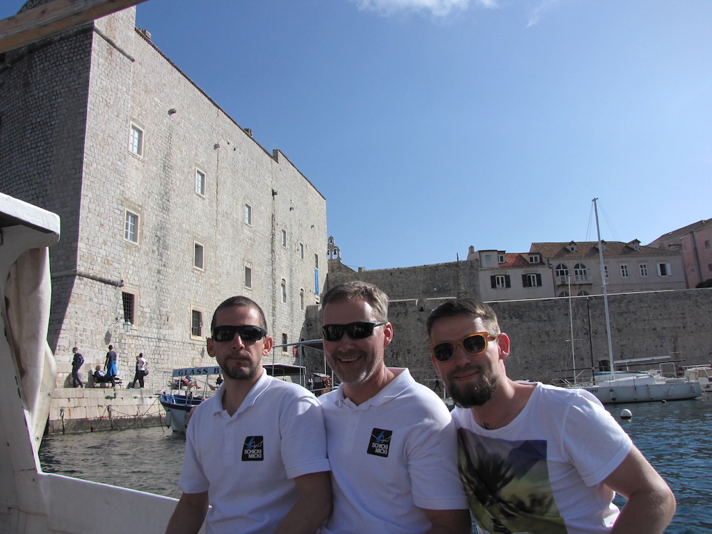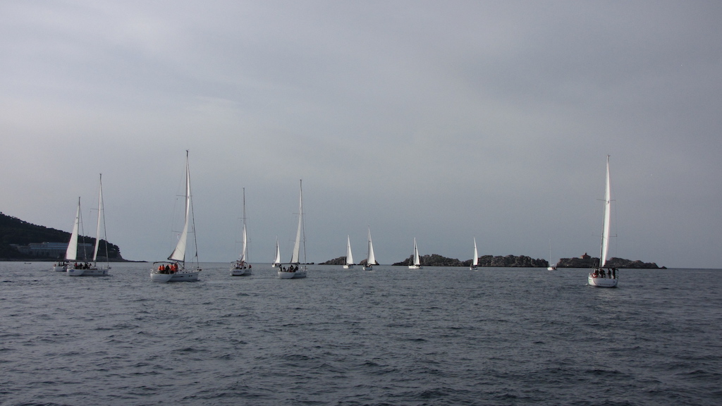 Po krátké procházce a konstatování, že bez turistů je to tu fakt hezké, jsme u kávy ve starém přístavu začali řešit návrat do maríny. Jako nejlepší možnost jsme zvolili přemluvit někoho z místních, aby nás tam na své loďce odvezl. To se nám po chvíli hledání skutečně podařilo, a tak jsme nakoupili zásoby na téměr hodinu a půl trvající cestu kolem celého starého města a vesele vyrazili. Plavba kolem hradeb na chatrné loďce jednoho z místních byla pro všechny nezapomenutelným zážitkem. Cestou jsme se z našeho nového kapitána snažili dostat nějaké rady ohledně počasí a trasy, kterou zvolit. Bohužel jediné co jsme z něj dostali byla rada, že bude foukat jugo a že on by rozhodně nikam nevyplouval. Když jsme se snažili vysvětlit, že jedeme závod a vyplout musíme, tak jen mávl rukou a pokračoval v plavbě. Večer v maríně jsme znovu probrali taktiku na druhý den, zkontrolovali předpovědi počasí a šli brzo spát.