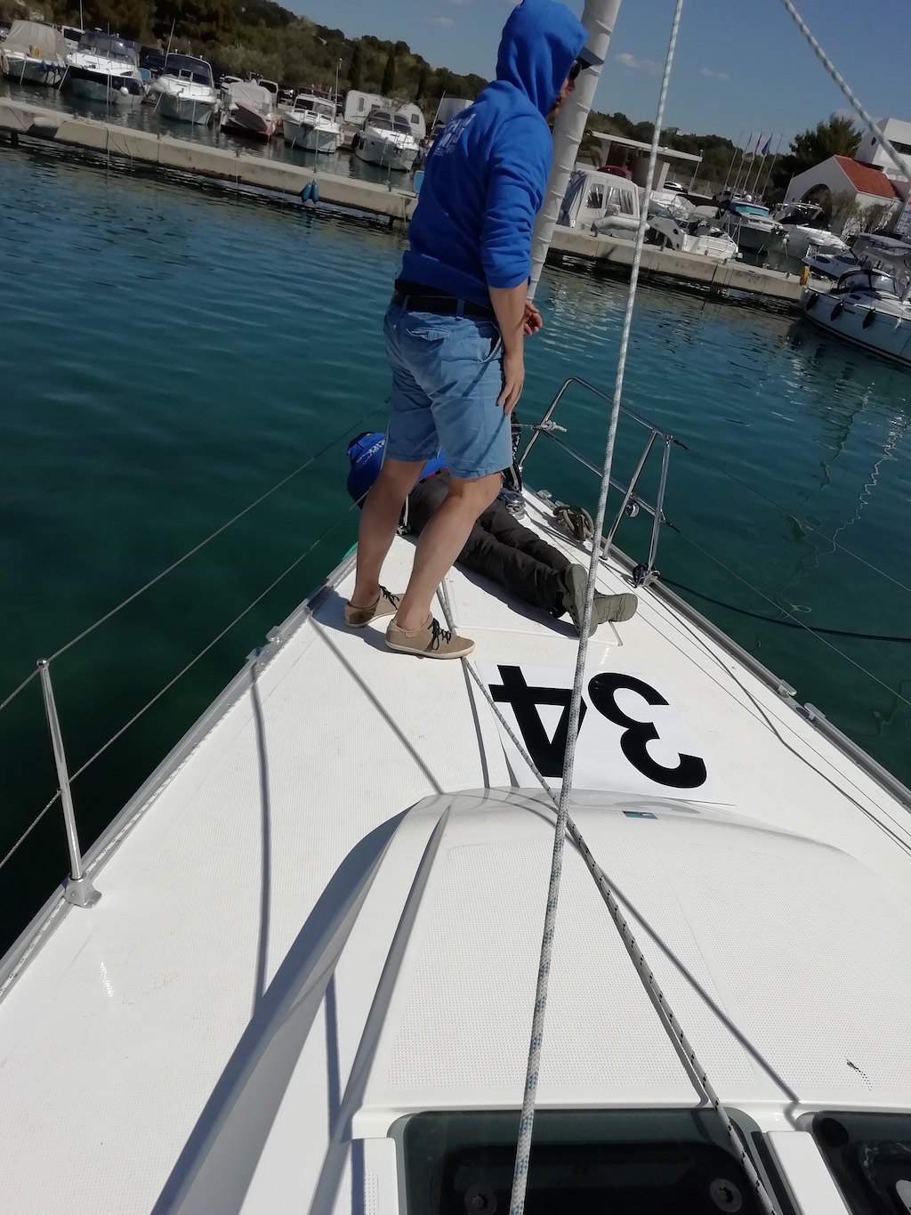 Druhý den jsme chtěli ráno vyrazit časně, abychom v sílícím větru zkusili nastavení lodě a plachet. Ale jako obvykle nás zdrželi místní servisní technici, kteří po několika urgencích a ujištění, že ho opravdu budeme potřebovat, začali spravovat rozbitý stoper. Podařilo se nám tedy marínu opustit před poledem a vyjeli jsme před Murter, kde jsme si vše vyzkoušeli. Loď jela pěkně a překvapivě vše fungovalo.